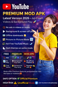 The free version, however, includes frequent ads π€, no background playback, and limited offline access. Because of this, many users search for YouTube Premium Mod APK Latest Version 2026 β an unofficial modified app that claims to unlock Premium features without a subscription β οΈ.